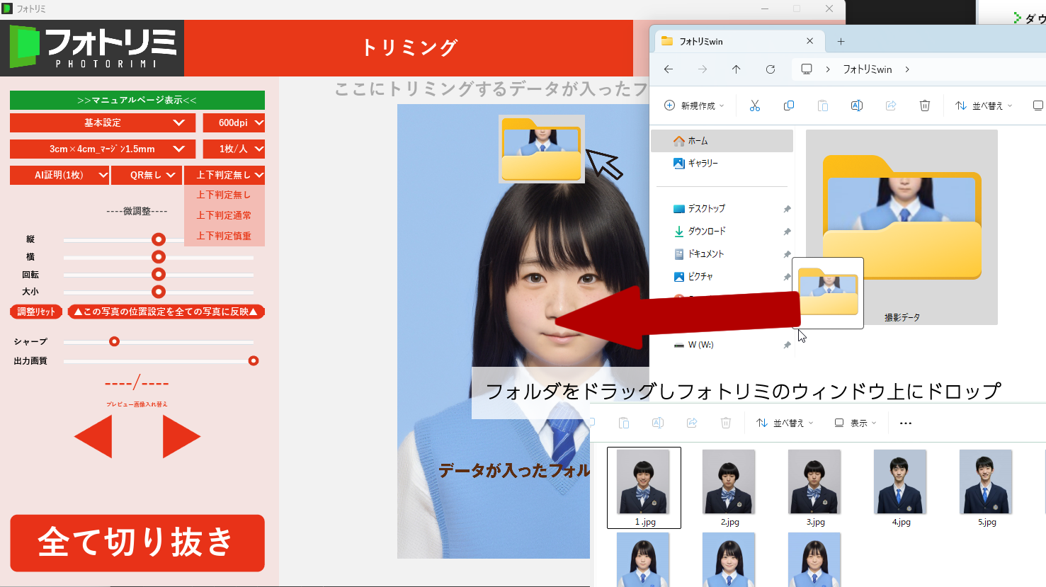 撮影データが入ったフォルダをフォトリミにドロップする