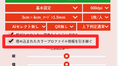 埋め込まれたカラープロファイル情報を引き継ぐにチェックを入れます。