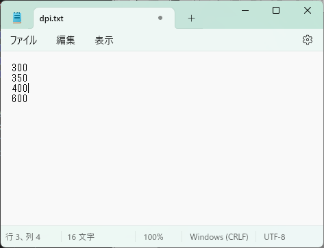 設定フォルダ内にある「dpi.txt」をメモ帳、テキストエディタなどで開き編集します。