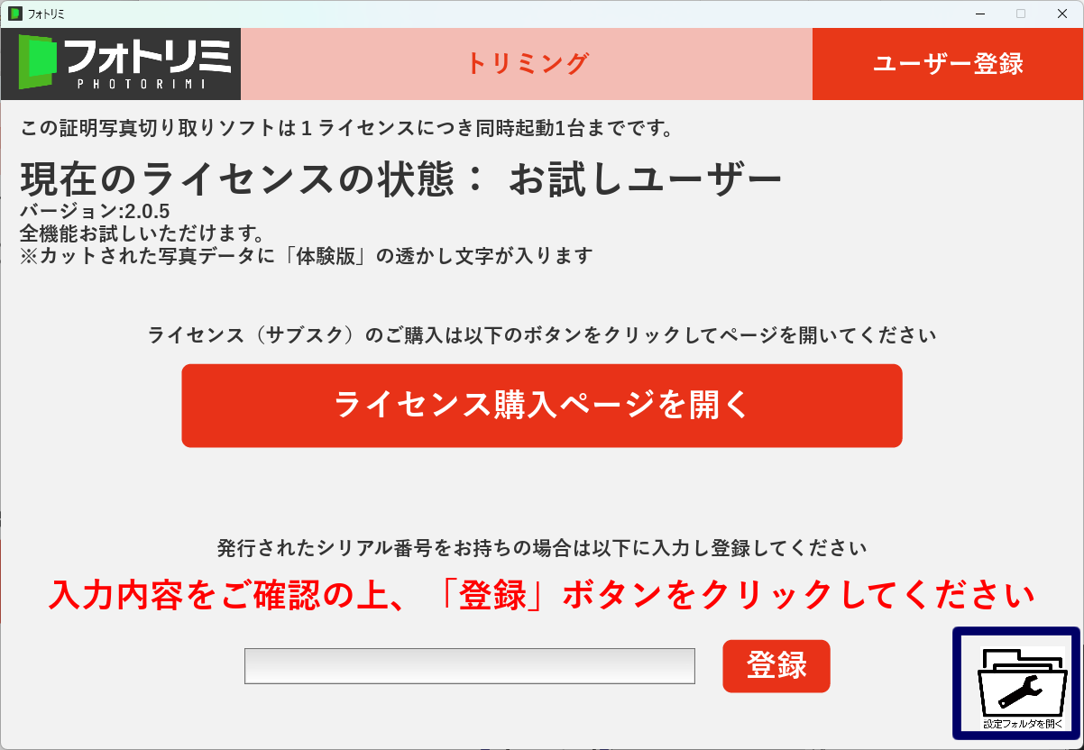 ユーザー登録画面右下の設定ファイルを開くアイコンをクリック